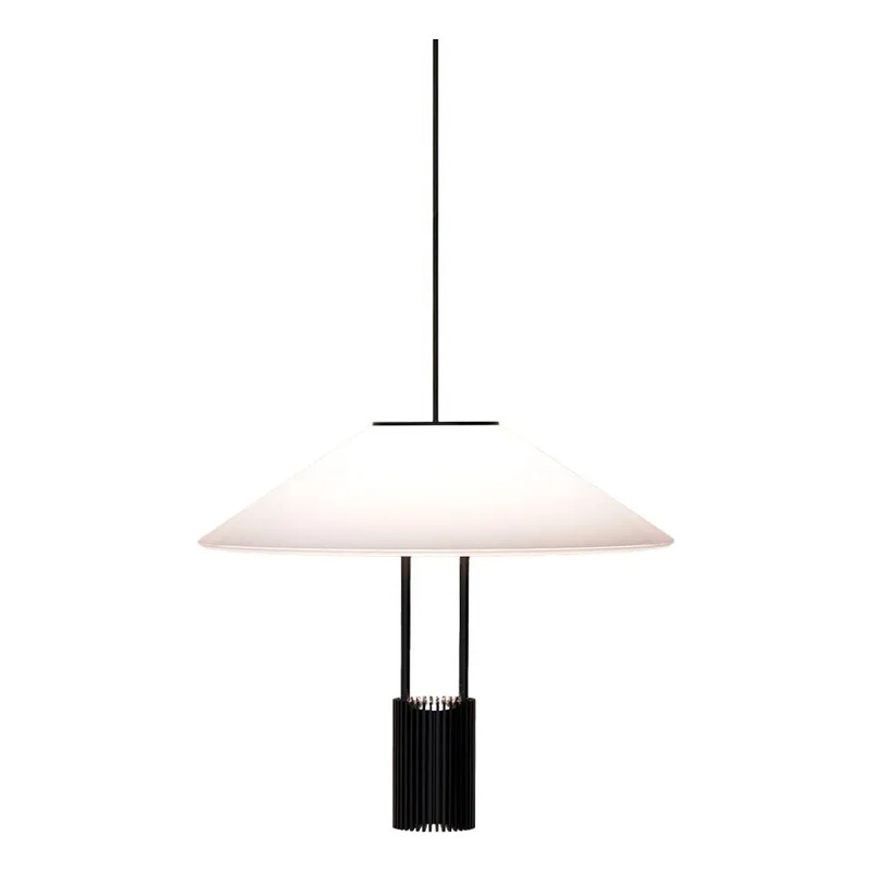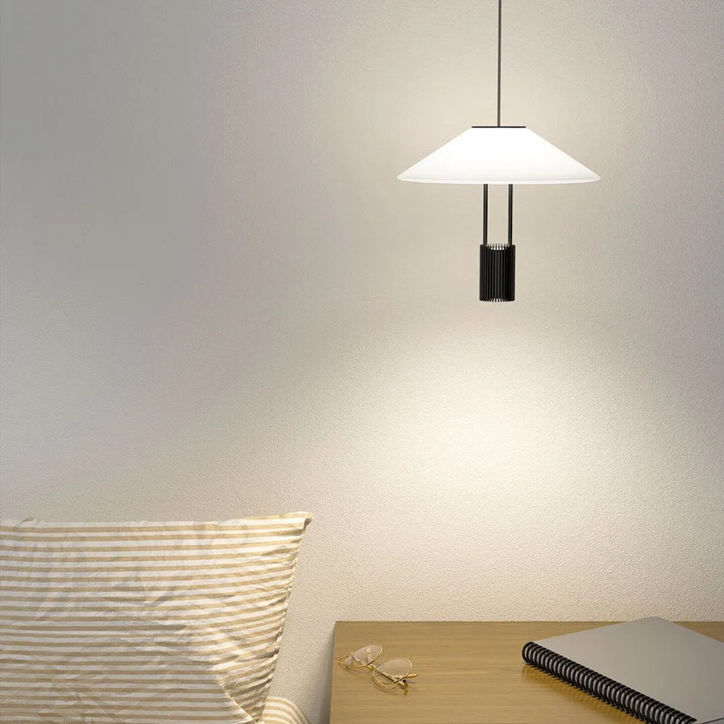 Luminaria suspendida compuesta por cuerpo de aluminio y difusor acrílico. Emite una luz cálida (3000ºK) con una potencia de 10W, adecuada para iluminación puntual o de ambiente. Su diseño combina una pantalla cónica blanca con un detalle lineal en el cuerpo inferior, que actúa como disipador y soporte. Ideal para instalar sobre mesas de luz, escritorios o espacios de lectura.