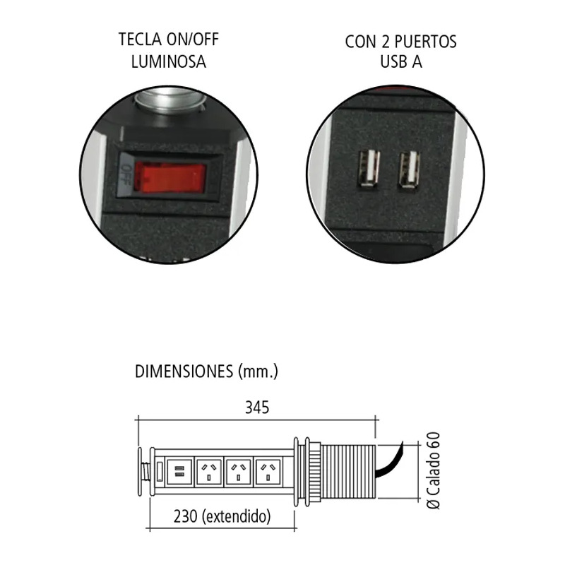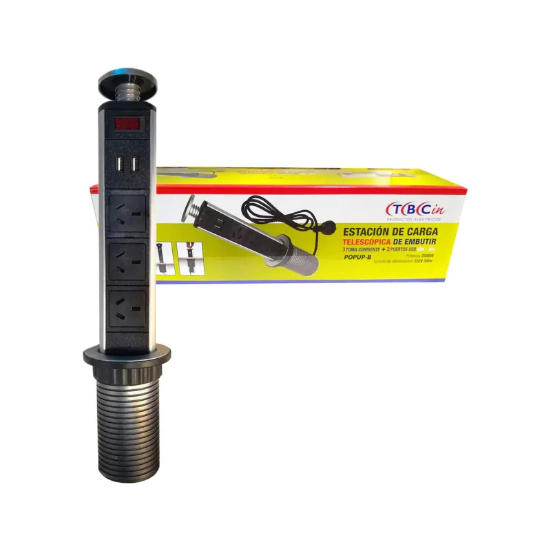 - 3 Tomas Corriente más 2 Puertos USB carga rápida 2A