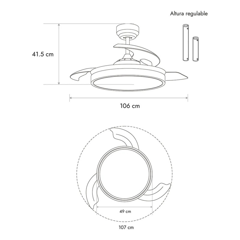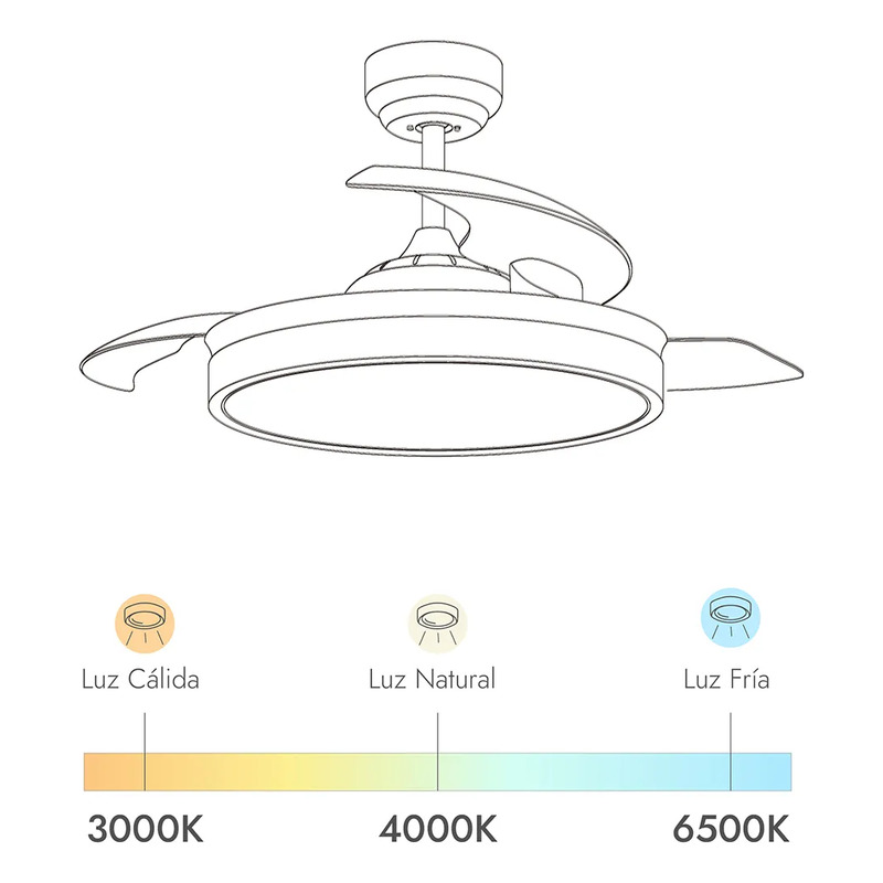 Incluye iluminación LED de 36W con tres tonos seleccionables (cálida, natural y fría), que podés ajustar desde su control remoto multifunción. Cambiá la luz, velocidad o temporizador sin moverte.